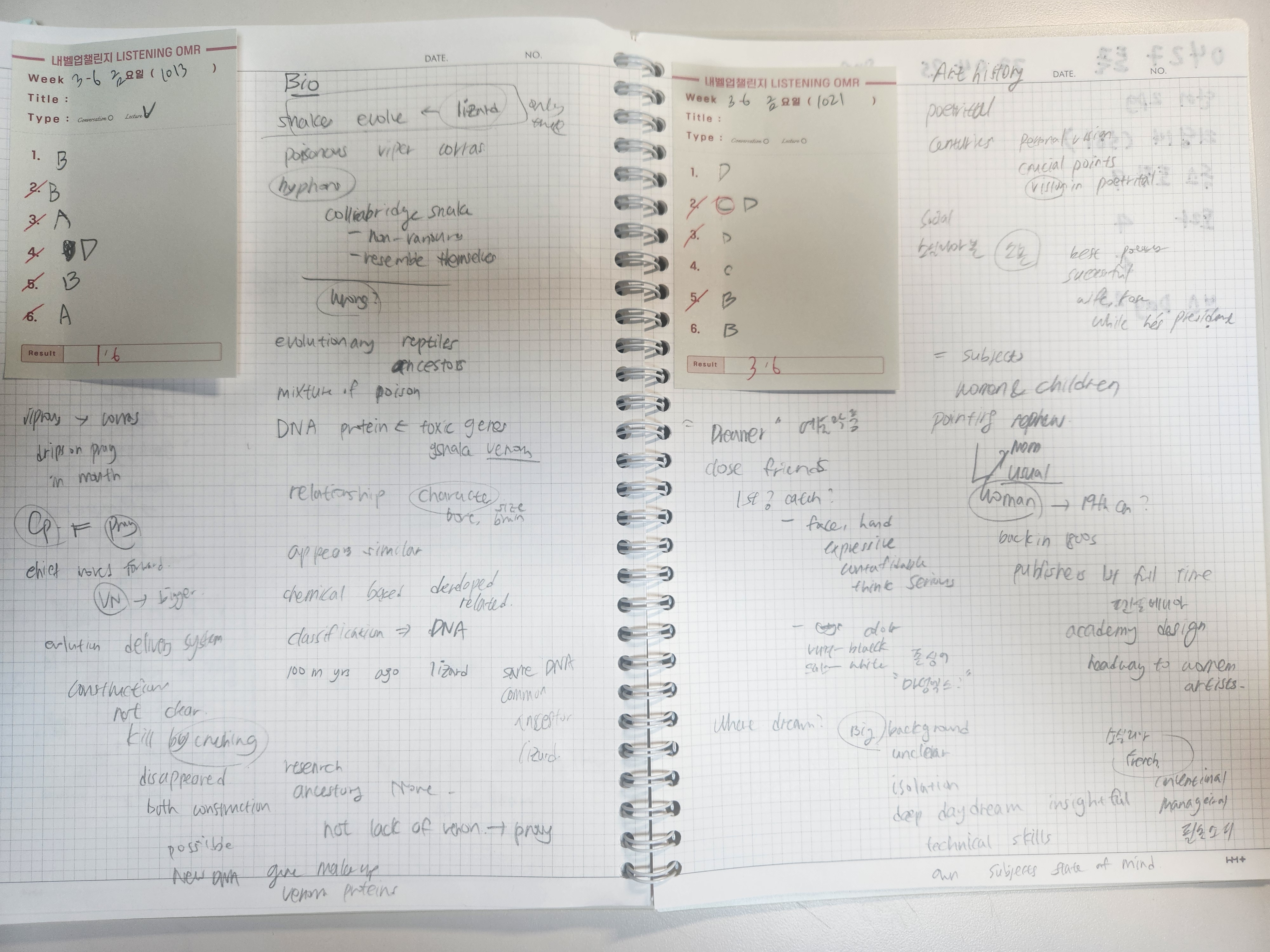 리스닝 뱀 관련 렉쳐에서 진짜 거의 띠용하는 수준으로 못알아 들었다. 오답도 했는데 못알아들어서 스크립트를 보며 옛날에 자주하던 섀도잉을 하며 해보려했다. 정말 과학적 용어는 언제봐도 어려운 것 같다.