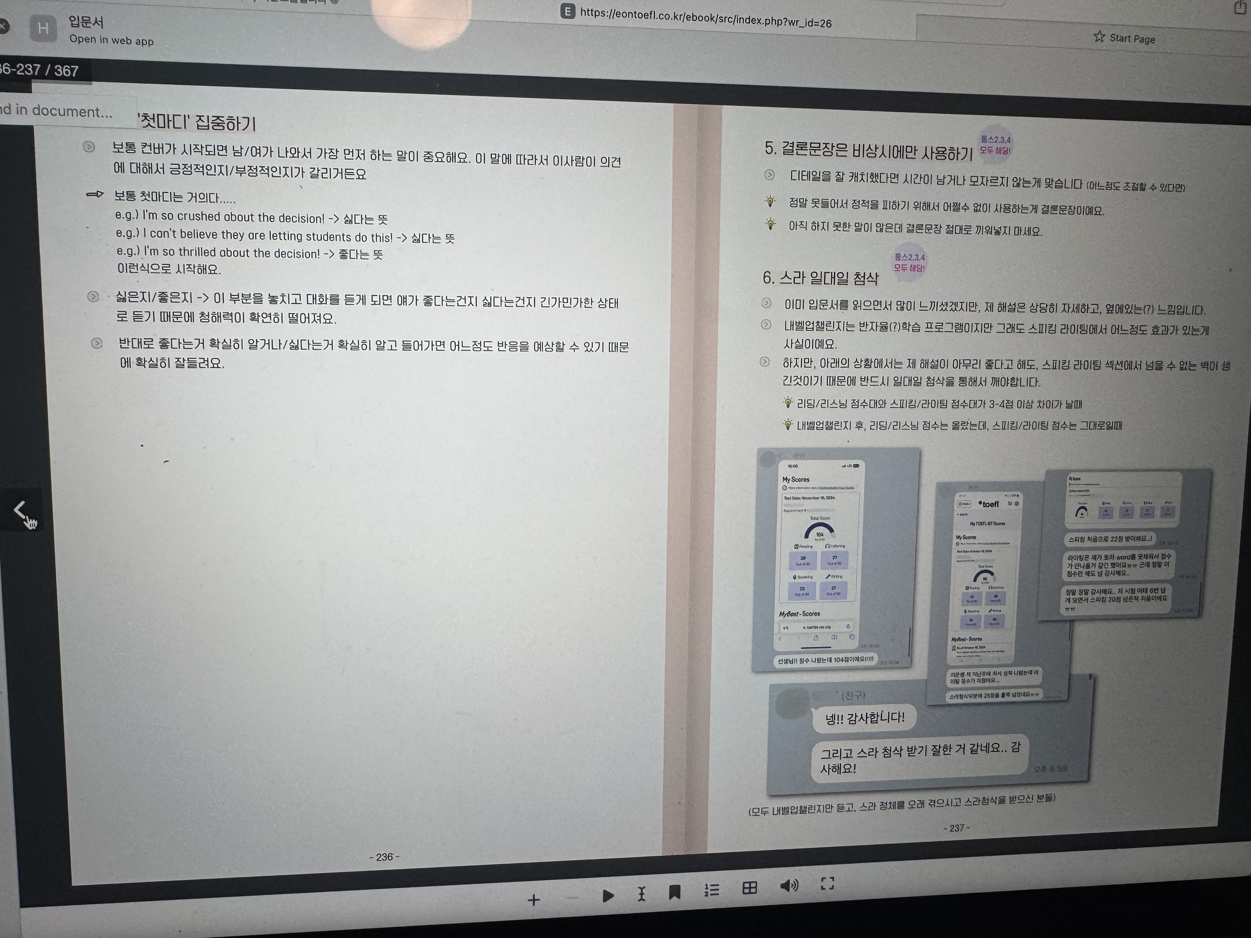 오늘 입문서 내용은 스피킹 섹션에 관한 내용이었는데 통합형 독립형 등의 유형별 대처 방법 사고 흐름 등을 직관적으로 상세히미리 알아볼 수 있었다. 특히 즉석에서 말하는 능력을 본다는 말이 정말 공감되면서도 살짝 무서웠다. 소시오패스가 되라는 말이인상 깊었는데 정말 시험장에서는 내 의견을 얼마나 어떻게 잘 표현할지가 아니라 가장 영어로 논리적으로 말할 수 있는 답변이우선시 되어야하는 게 정말 맞는 것 같다. 가끔 수업에서 그냥 하나의 다른 인격으로 산다 생각하고 내가 아는 단어로만 답변을구성하기 위해 아예 다른 입장을 택한 경험이 떠올랐다