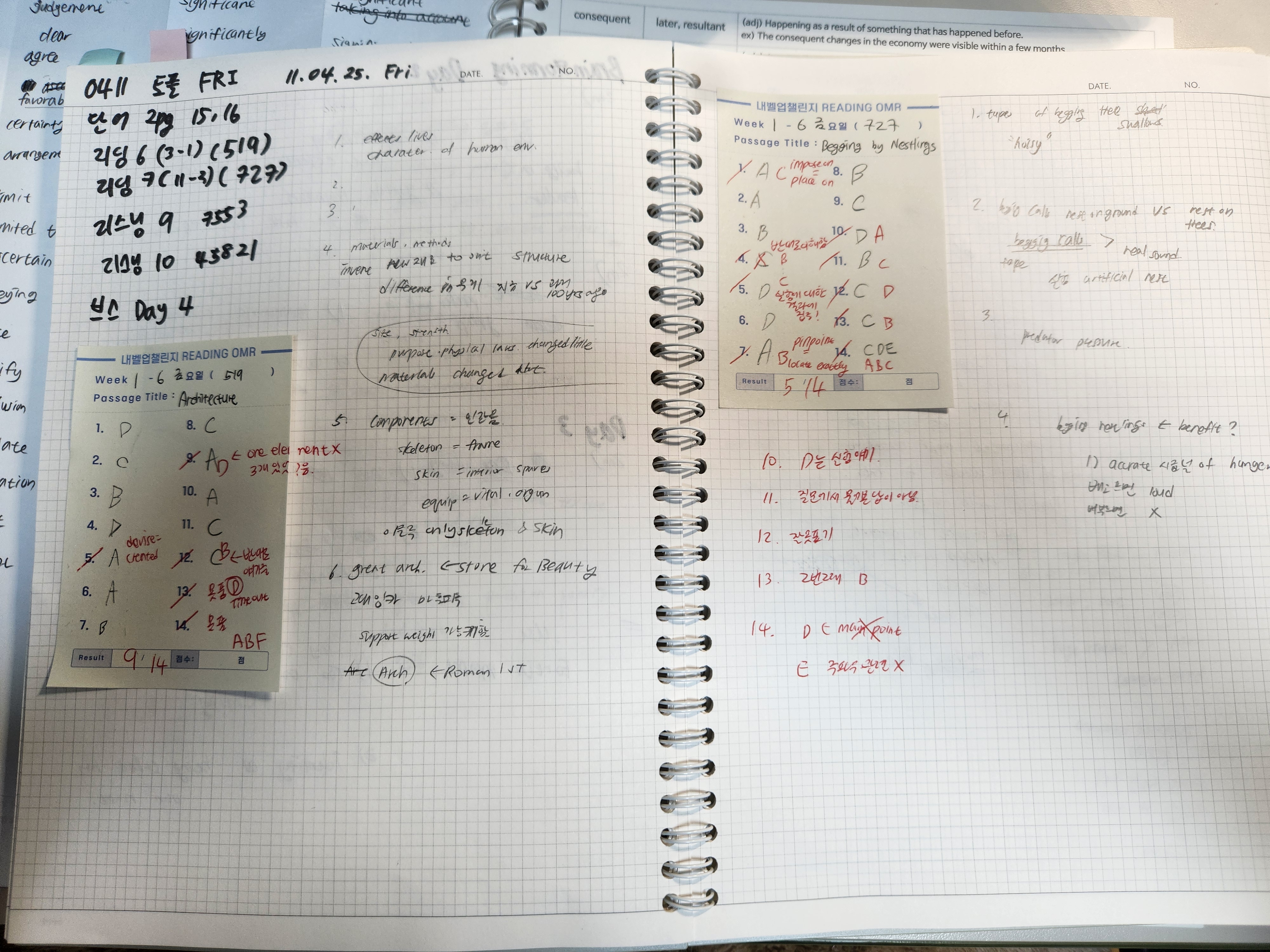 오늘은 리딩에서 많이 헤맸다. 입문서를 더 집중해서 읽고 풀이법도 5번은 넘게 정독을 아침에 하고 풀은 문제라 자신감이 있었지만 너무 피곤한 나머지 두번째 지문 10분지나고 거의 눈에 안읽히는 현상이 발생했다. 그렇다. 졸았다. 집중력이 흐트려져서 첫번째 지문은 집중하고 노트테이킹에 집중해 뒷 2문제를 시간이 없어서 못푼 반면에 2번째 지문은 거의 못풀었다고 하는게 맞다. 정신차려야지..